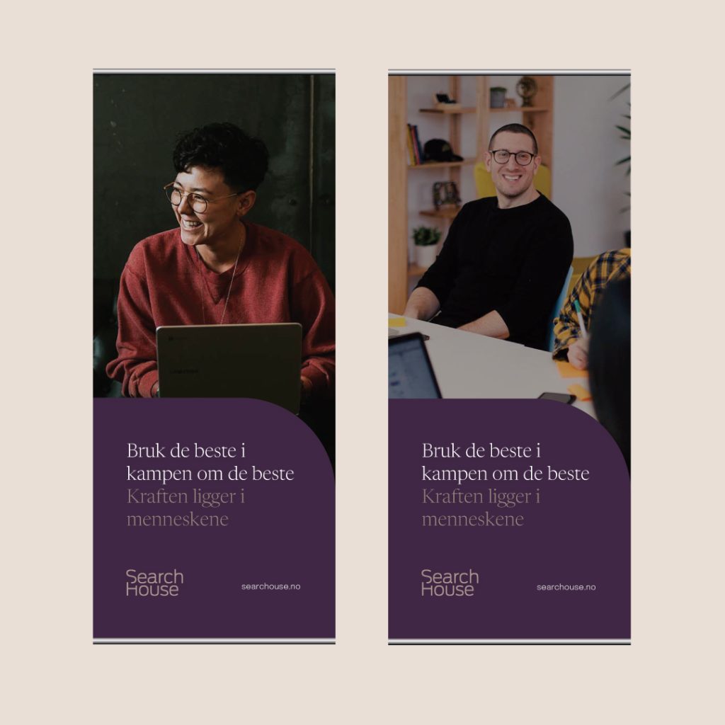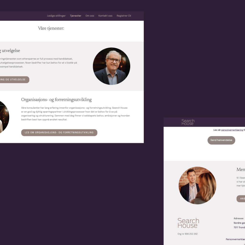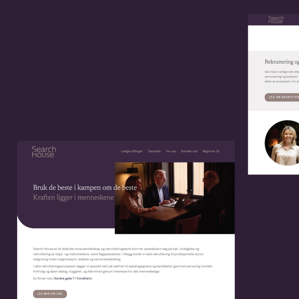 Search House er et ledende konsulentselskap og rekrutteringsbyrå som har spesialisert seg på søk, utvelgelse og rekruttering av topp- og mellomledere, samt fagspesialister. Vi har gjort en profil-oppfrisking og nye nettsider. Kunden ønsket en profil som var mykere, og føltes mer nær i og med at de jobber med mennesker. I tillegg var det viktig å ha en profil som skiller seg ut i fra konkurrentene. Logoen er beholdt, men optimalisert for bruk i flere flater. Talkto har tilført nye farger, fonter og visuelt uttrykk som gir et helhetlig uttrykk, og veldig ulikt de andre aktørene i bransjen.