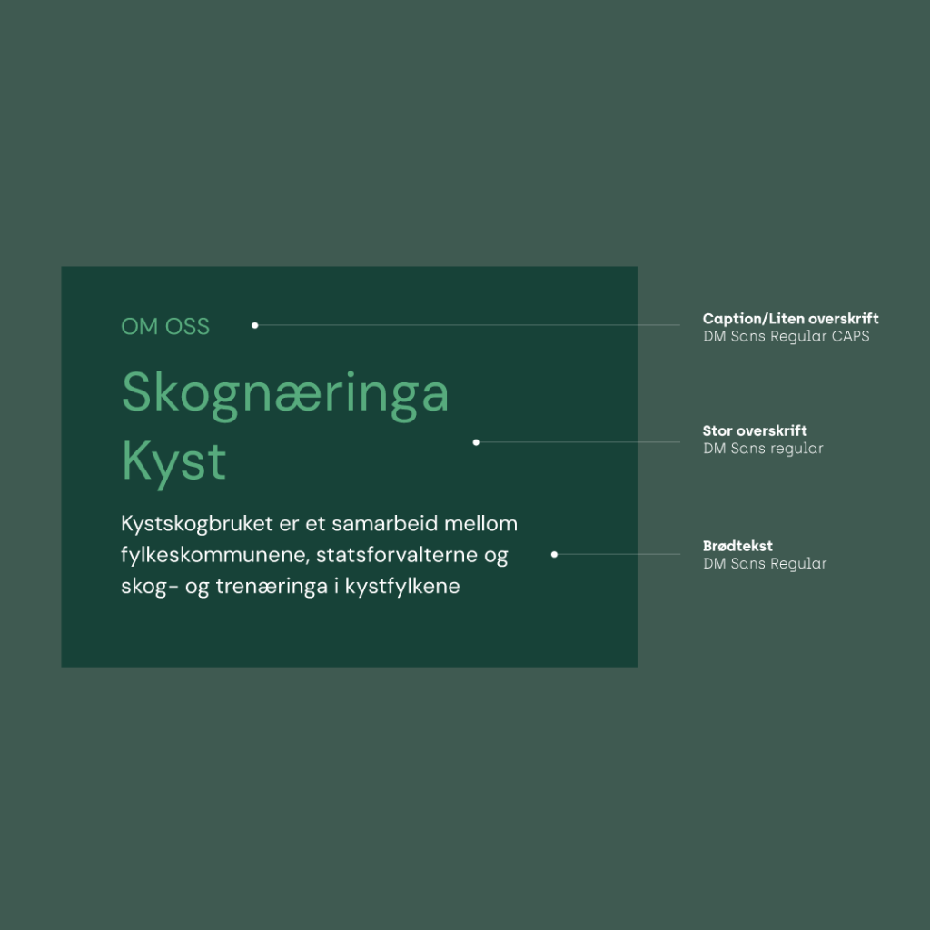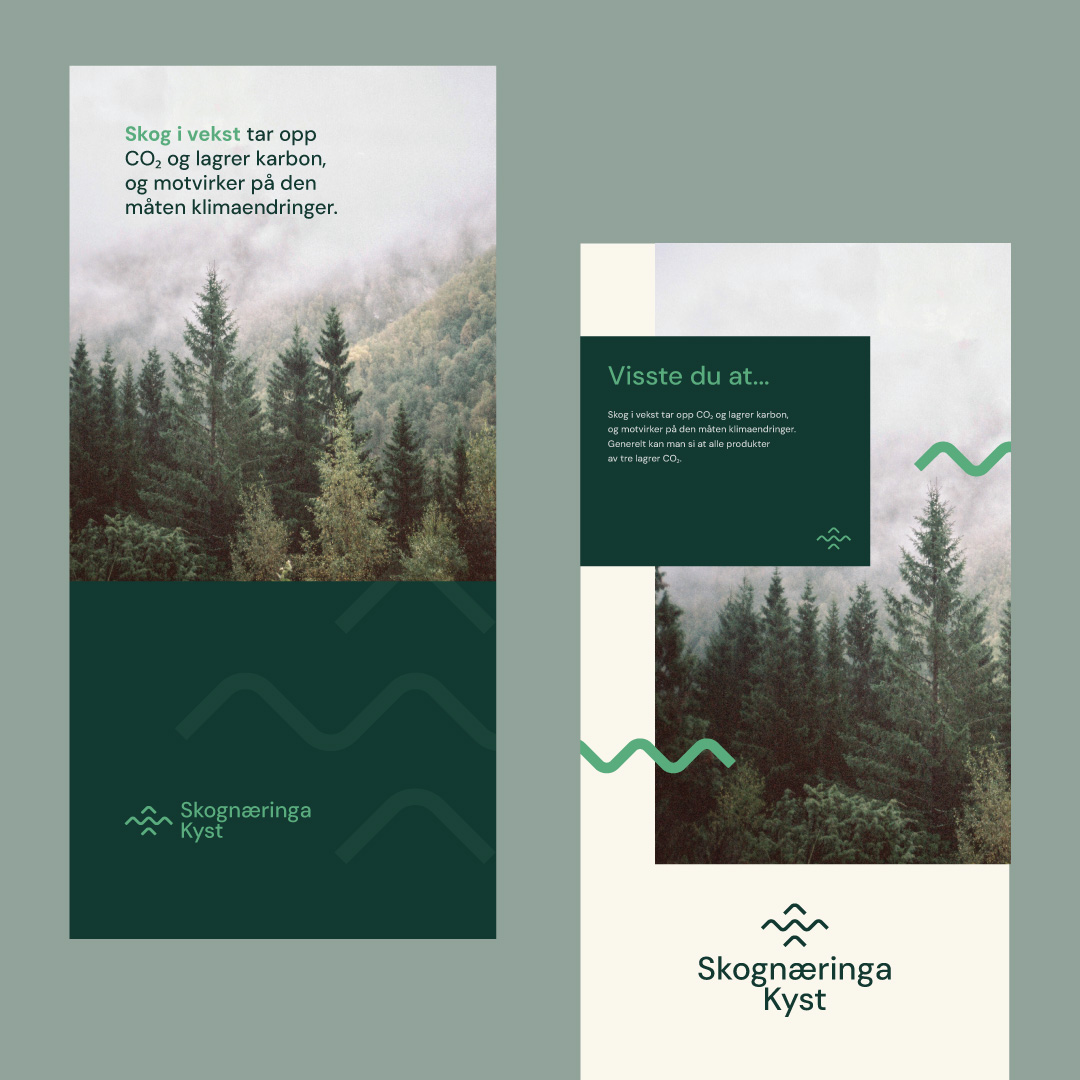 Skognæringa Kyst er Skog- og trenæringas verdikjedesamarbeid i Kystskogbruket. De skal løse ut potensialet i skog- og trenæringa langs kysten. Vi har laget ny visuell identitet, og jobber med de om å bygge opp sin egen merkevare, samtidig som at det skal være tydelig at de er en del av- og representerer Kystskogbruket.